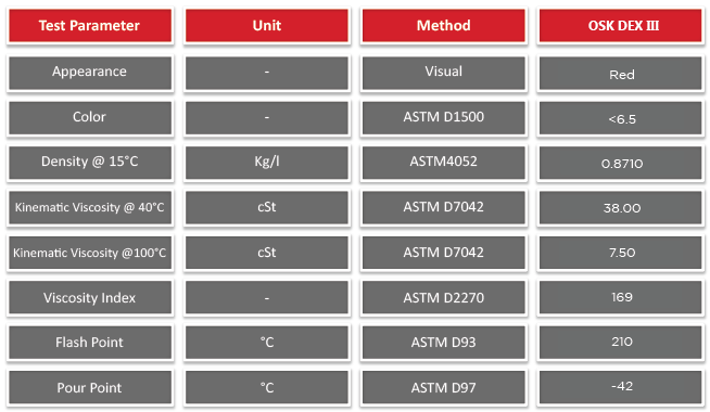 OSK Automatic Transmission Fluid DIII is specially formulated for use in automatic and power shift transmissions. It is formulated using high quality base stock and advanced additive technology to give superior performance. ​