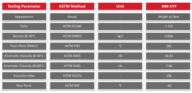 OSK FULLY SYNTHETIC CVT FLUID is a premium fully synthetic transmission fluid formulated for use in vehicles equipped with chain or push belt Continuously Variable Transmissions (CVT). It is combined with highly sophisticated additive package to provide critical functional and viscosity for the special transmissions.